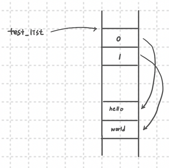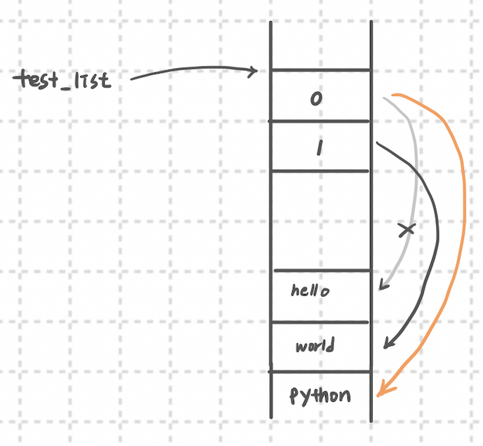 0번 인덱스가 가리키고 있던 hello 문자가 저장되어있는 주소로 가는 화살표가 취소되고 python 문자가 저장되어있는 주소로 가는 화살표가 새로 생겼습니다. 그런데 test_list 리스트의 시작 주소는 여전히 동일한 곳을 가리키고 있습니다. 시작 주소는 동일하면서 내부 값만 변경되어 mutable 하다고 할 수 있습니다.