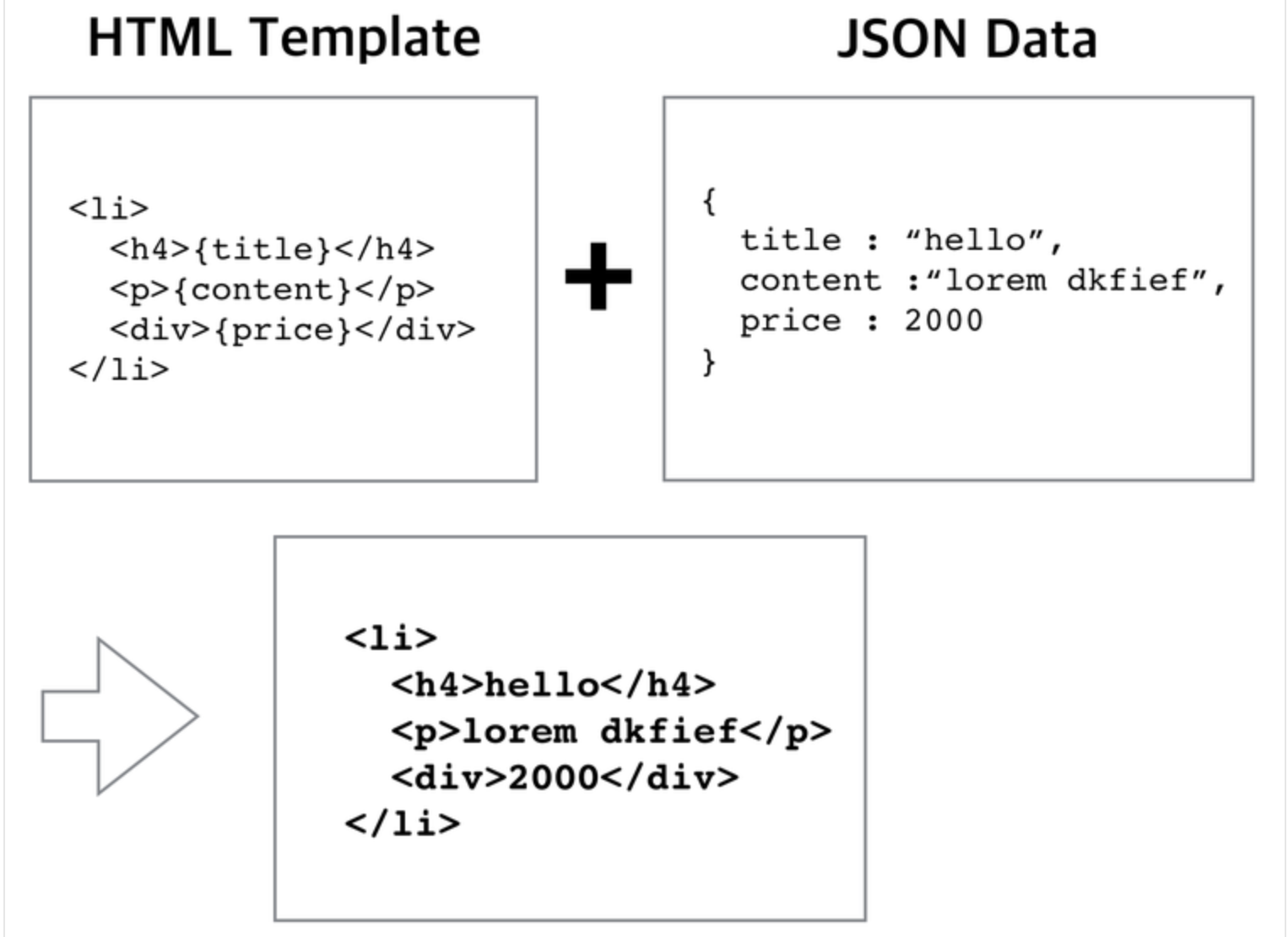 Ajax를 통해 서버로부터 JSON 데이터를 받아 화면에 출력해야 되는 경우, 반복적인 HTML부분을 template로 만들어두고, 서버에서 온 데이터를 결합해 화면에 추가하는것이 HTML templating 이라고 합니다.