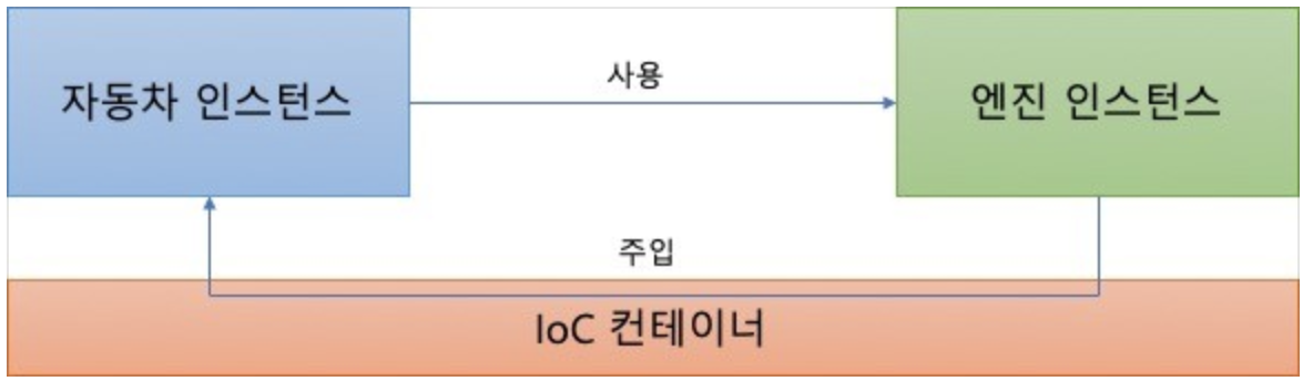 개발자가 직접 객체 생성하는 코드를 작성하는 것이 아닌, IoC컨테이너가 엔진 type의 객체를 생성해두면, 자동차 class에서는 이미 생성된 엔진 type의 v5 객체를 @Autowired 어노테이션을 선언후 사용만 하면 됩니다.